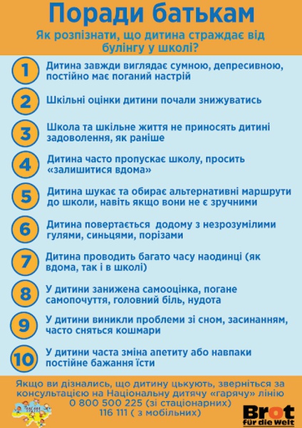 7. Розкажіть дитині, що немає нічого поганого у тому, щоб повідомити про агресивну поведінку щодо когось учителю або принаймні друзям. Поясніть різницю між “пліткуванням” та “піклуванням” про своє життя чи життя друга/однокласника.